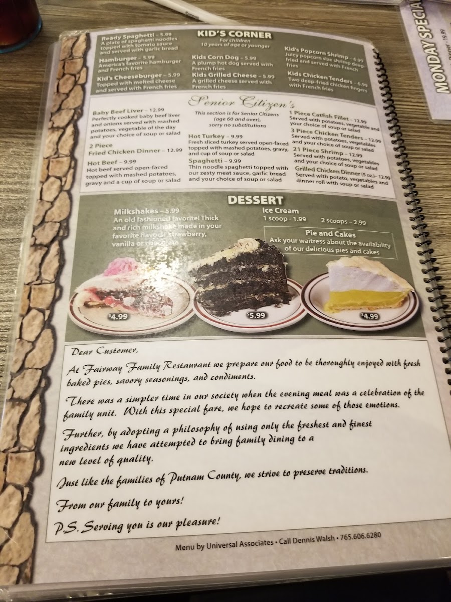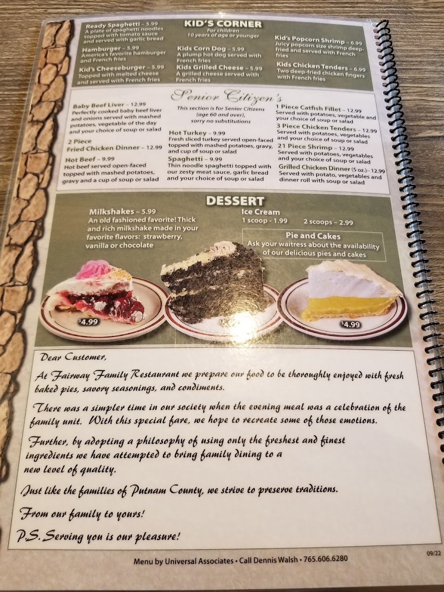 Welcome to Fairway Family Restaurant, a beloved dining spot located in Greencastle, Indiana. Known for its cozy, family-friendly atmosphere, it offers a diverse menu that ensures something for everyone. Start your day with a hearty skillet, featuring options like the Western Skillet or the Meat Lovers Skillet, each priced around $10.99. Seafood lovers will relish the Fried Shrimp or the all-time favorite, Surf & Turf, expertly crafted for just $20.99.
